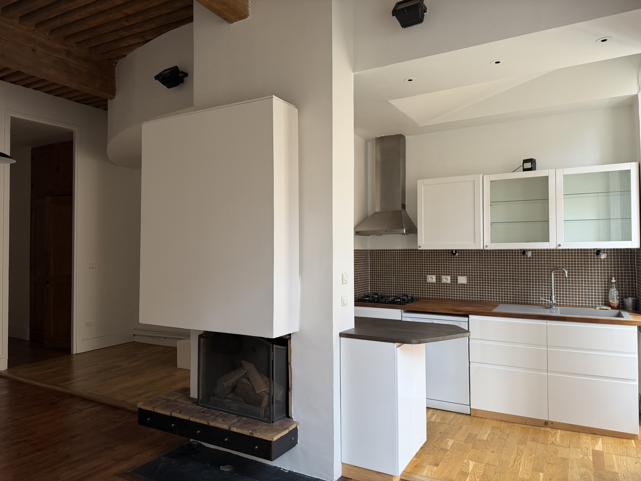 Electroménager : Frigo congélateur, plaque de cuisson gaz, four électrique, lave vaisselle, une hotte aspirante, un lave linge