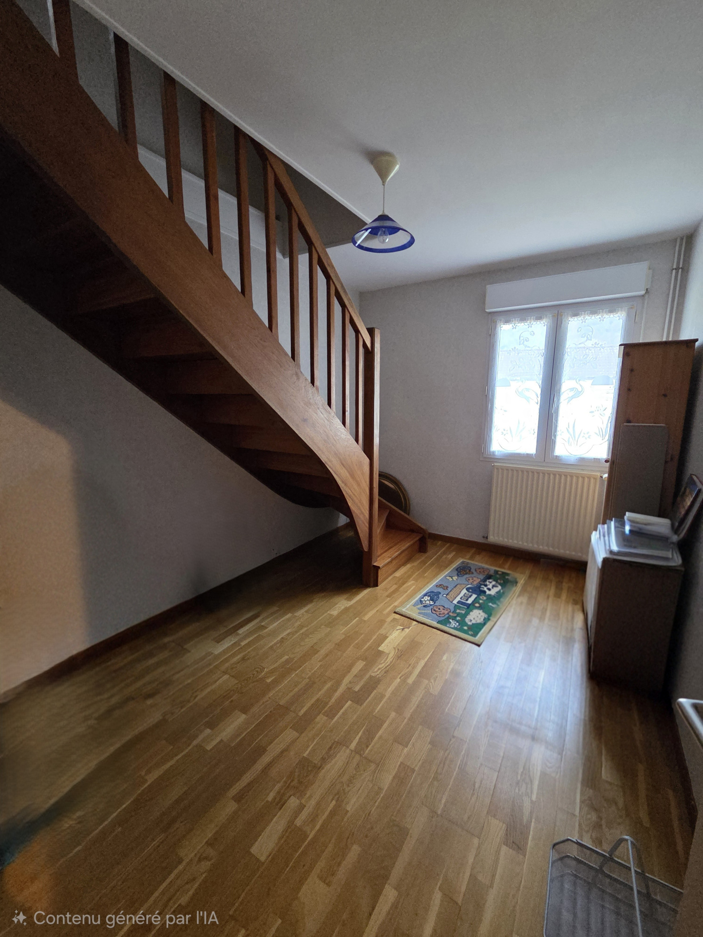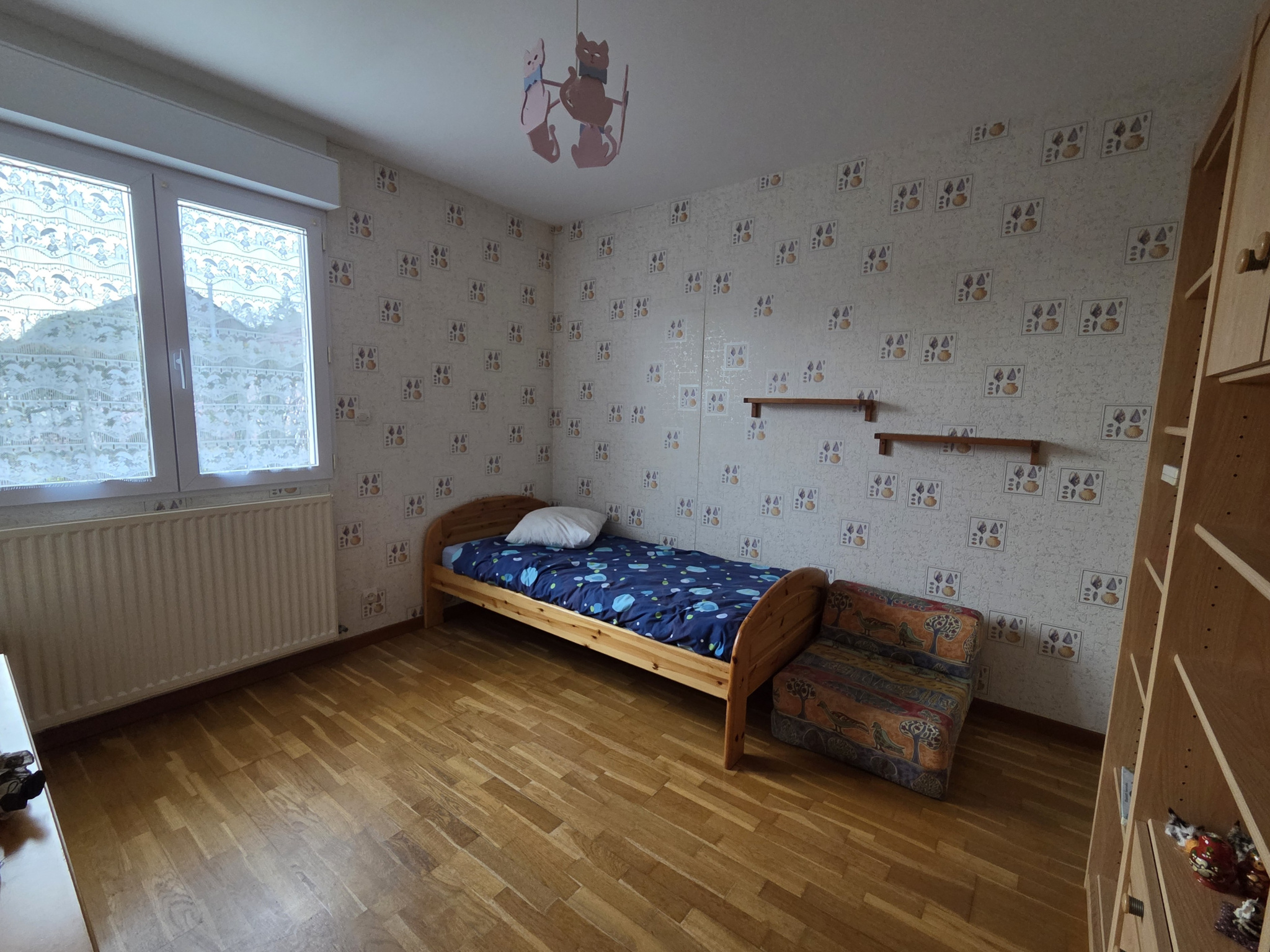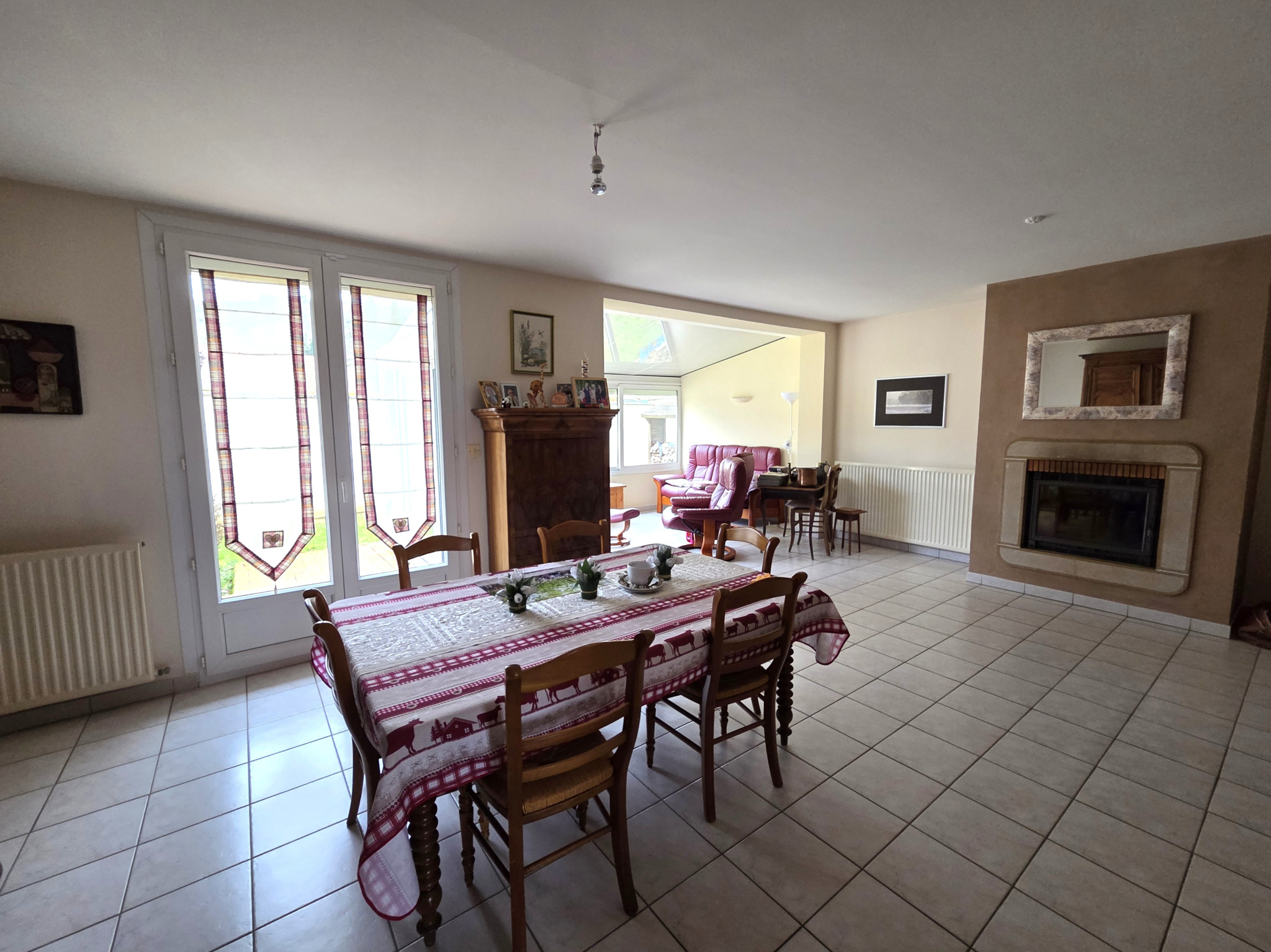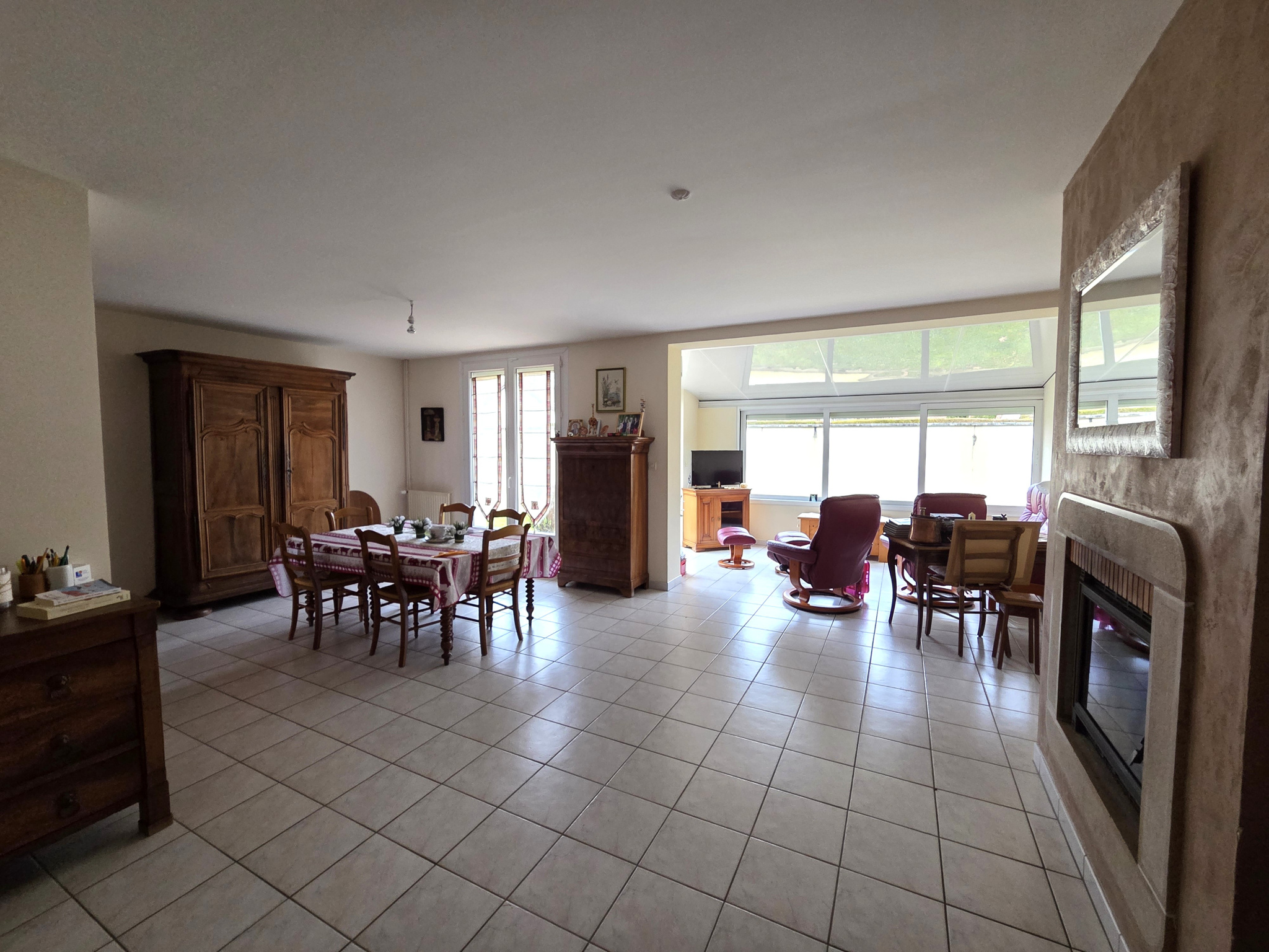 RDC : entrée avec placard, belle pièce de vie lumineuse avec insert et climatisation, cuisine séparée et équipée, quatre chambres, un bureau, SDE et SDB.