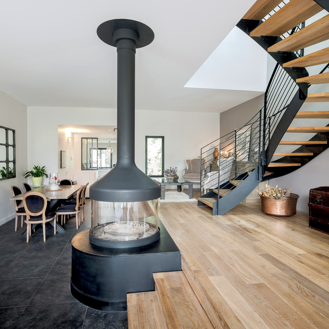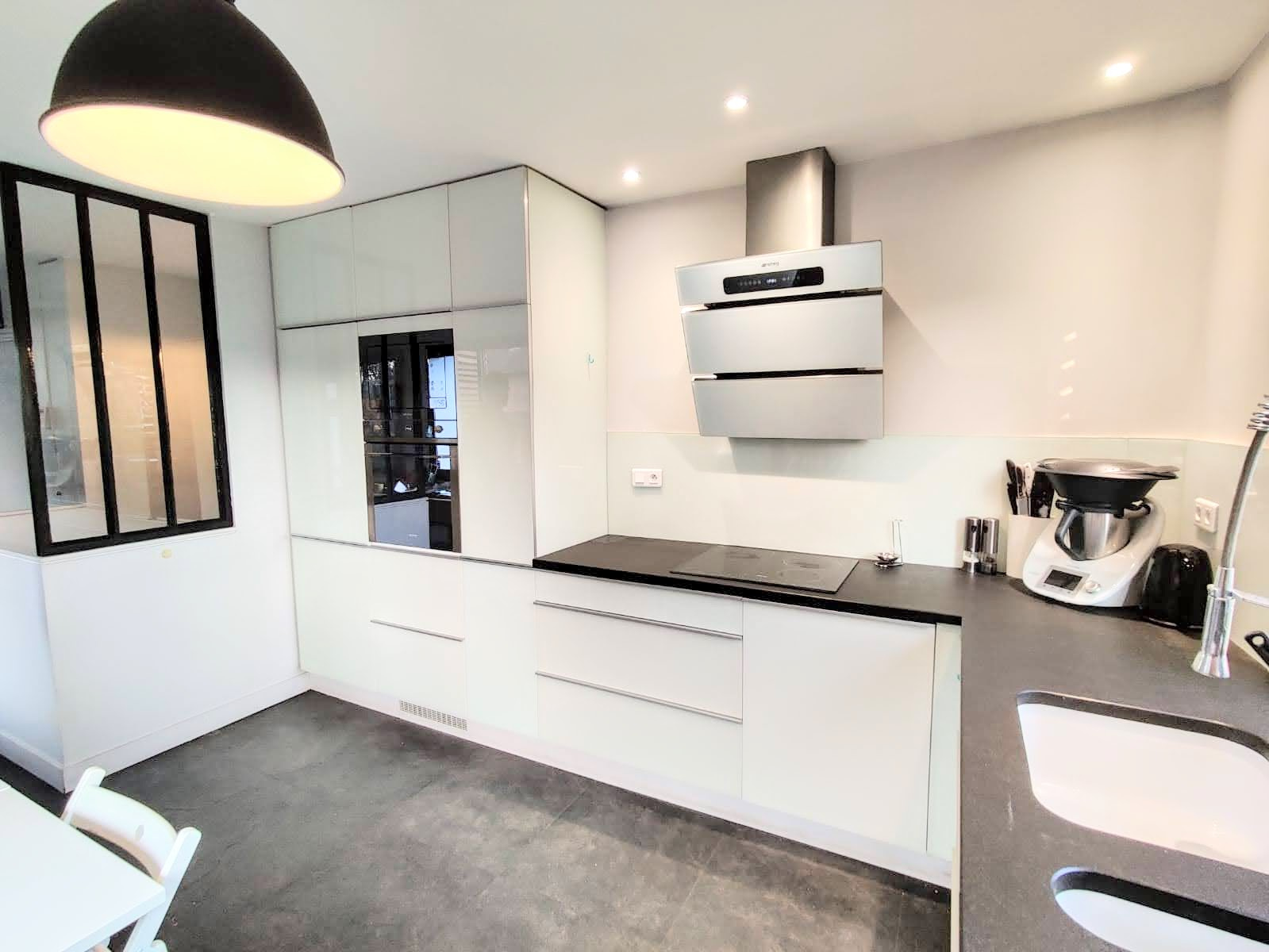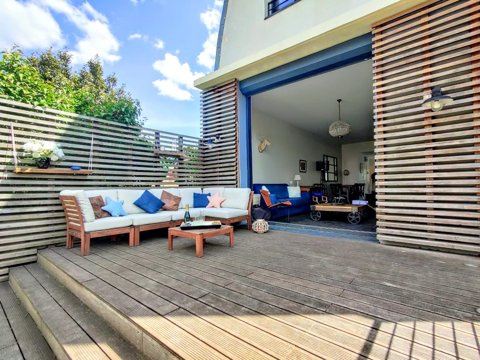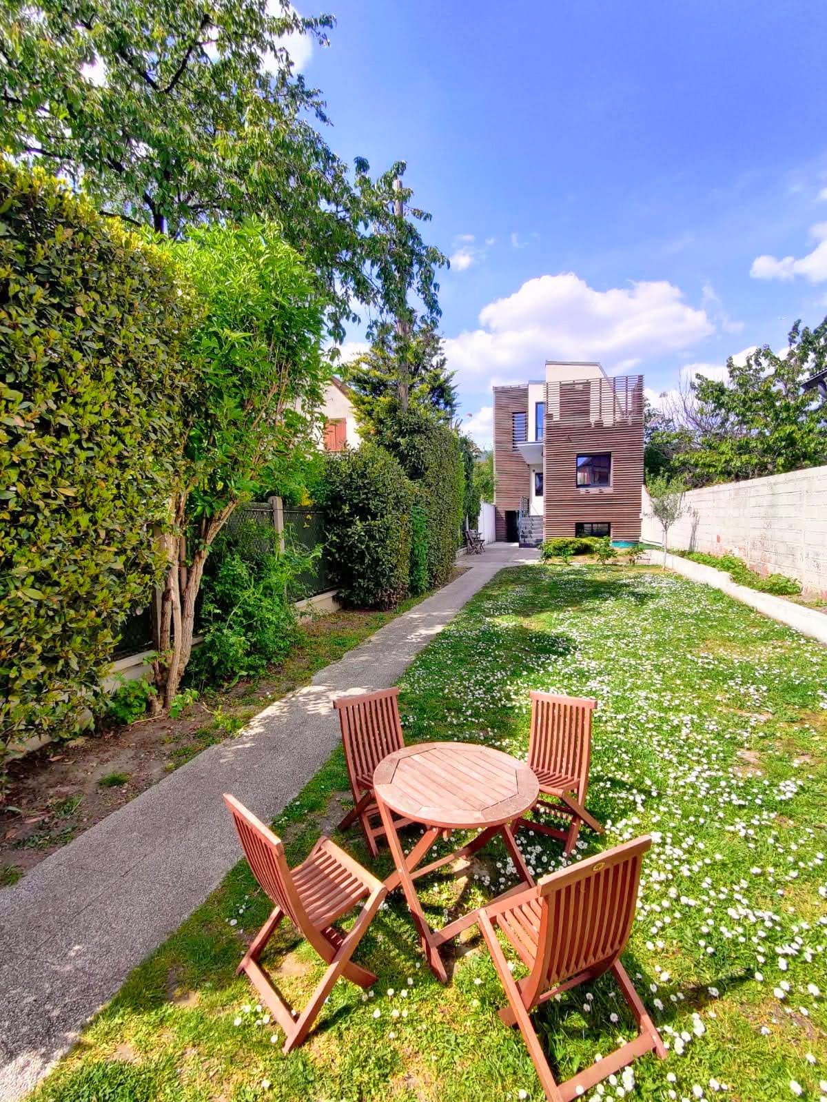 Colombes 92700 - Hauts-de-Seine Au coeur du quartier résidentiel des Champarons et à 7 minutes à pied de la gare du centre-ville, une belle et grande maison d'architecte avec un bardage en Red Cedar, de 200m2 de surface au sol totale, (181,01m2 de surface habitable totale), située en milieu de parcelle, sur un terrain de 631m2. Construite en 2012, agrandie et rénovée en 2019. La maison est exposée plein sud, et offre trois niveaux d'habitation. Rez-de-chaussée surélevé de 75m2, offrant une entrée avec placards, une cuisine équipée et aménagée, une double réception avec une cheminée, un espace bureau / bibliothèque, un toilette avec un lave-mains. Une baie vitrée à galandage s'ouvrant sur une terrasse de 15m2, et se prolongeant sur le jardin. Premier étage, quatre chambres avec dressings, dont une suite parentale de 14m2 avec une terrasse privative plein sud de 9m2, et une salle de douche. Une salle de bains, et un toilette séparé. Rez-de-jardin, une chambre de 13m2 exposée plein sud avec rangements, une grande buanderie, un espace dévolu à un congélateur et à la chaudière. Un appartement T2 de 26m2 avec son entrée indépendante, une cuisine équipée et aménagée ouverte sur un salon, une chambre avec dressing, une salle de douche avec une fenêtre et un toilette. L'accès à la maison est sécurisé par un portail électrique, ainsi qu'un portillon avec un digicode. Le stationnement prévoit trois places de parking. Au fond de la propriété, une dépendance d'environ 30m2, fermée par un rideau métallique électrique. Maison équipée d'un chauffage au sol, eau chaude produite par une chaudière au gaz de ville. Volets électriques, Vélux électriques avec fermeture automatique par détection de pluie. Triple vitrage anti effraction, et porte blindée. Dispositif alarme à activer. Isolation extérieure. Portique en bois scellé, avec balançoires et toboggan. Documents techniques à disposition, et sur demande.