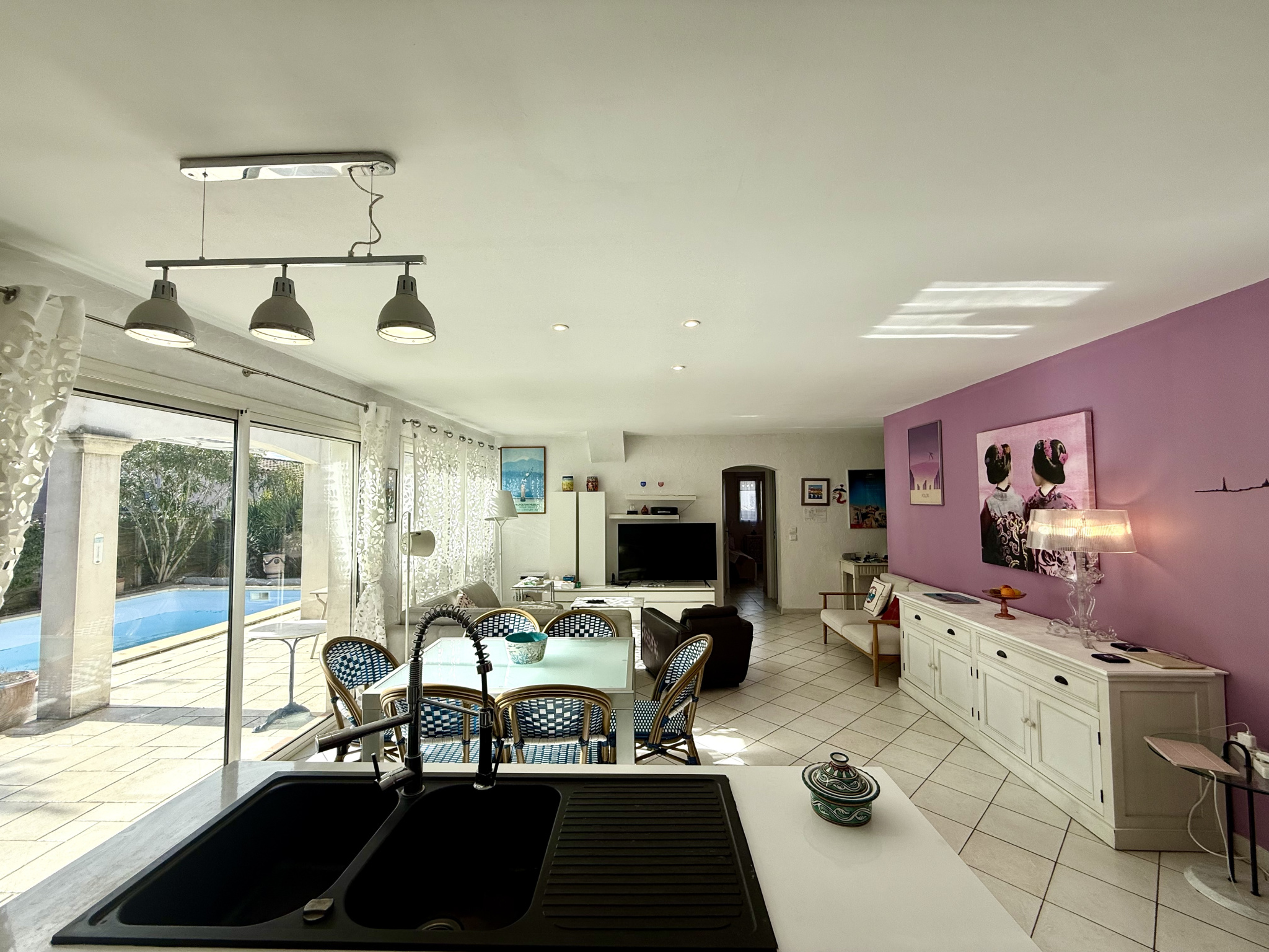 EXCLUSIVITE, VENDARGUES, maison de plain pied T6 parfaitement entretenue proche des commerces, des écoles et de toutes les commodités. Entrée avec placard, lumineuse pièce de vie exposée sud avec cuisine américaine quipée donnant sur la terrasse ensoleillée, 5 chambres avec placards aménagés dont une avec salle d'eau, buanderie, 3 salles d'eau et 3 wc. Piscine chauffée, panneaux solaires, volet roulants électriques, plancher chauffant et raffraichissant par pompe à chaleur air/eau, 2 portails d'accès pour le stationnement, alarme.... Contact Sandra: 06 98 54 88 34 - RSAC 393 265 038
