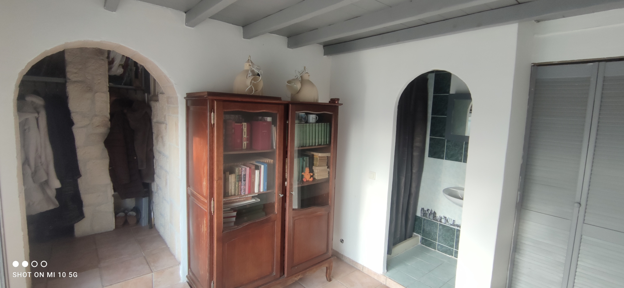 Depuis la pièce de vie : un escalier en bois dessert 12 m² de mezzanine (20 m² de surface au sol) avec fenestron pouvant être utilisé comme bureau, salle de jeux, espace détente et/ou chambre d'appoint et un sas aménagé servant d'accès à la 4° chambre de 10.5 m² équipée d'un coin douche, lavabo et placard ainsi qu'une baie vitrée.