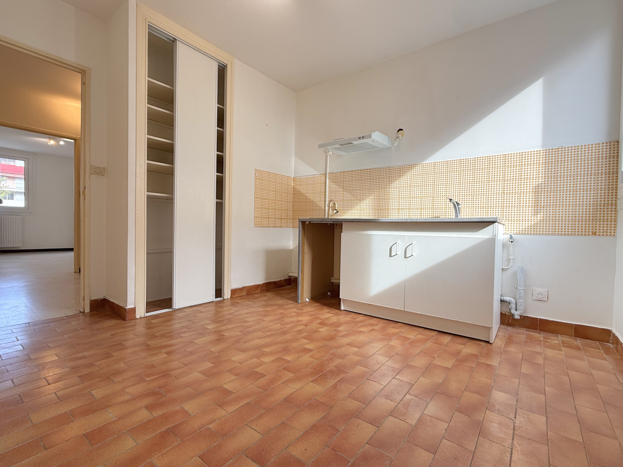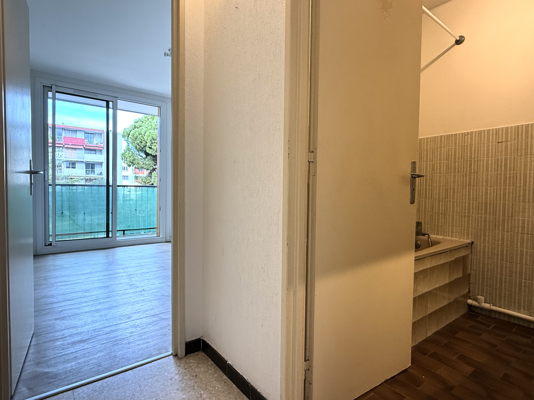 Vous entrez dans un séjour lumineux et facilement aménageable. Vous trouverez ensuite une cuisine séparée agrémentée d'une loggia pour le rangement