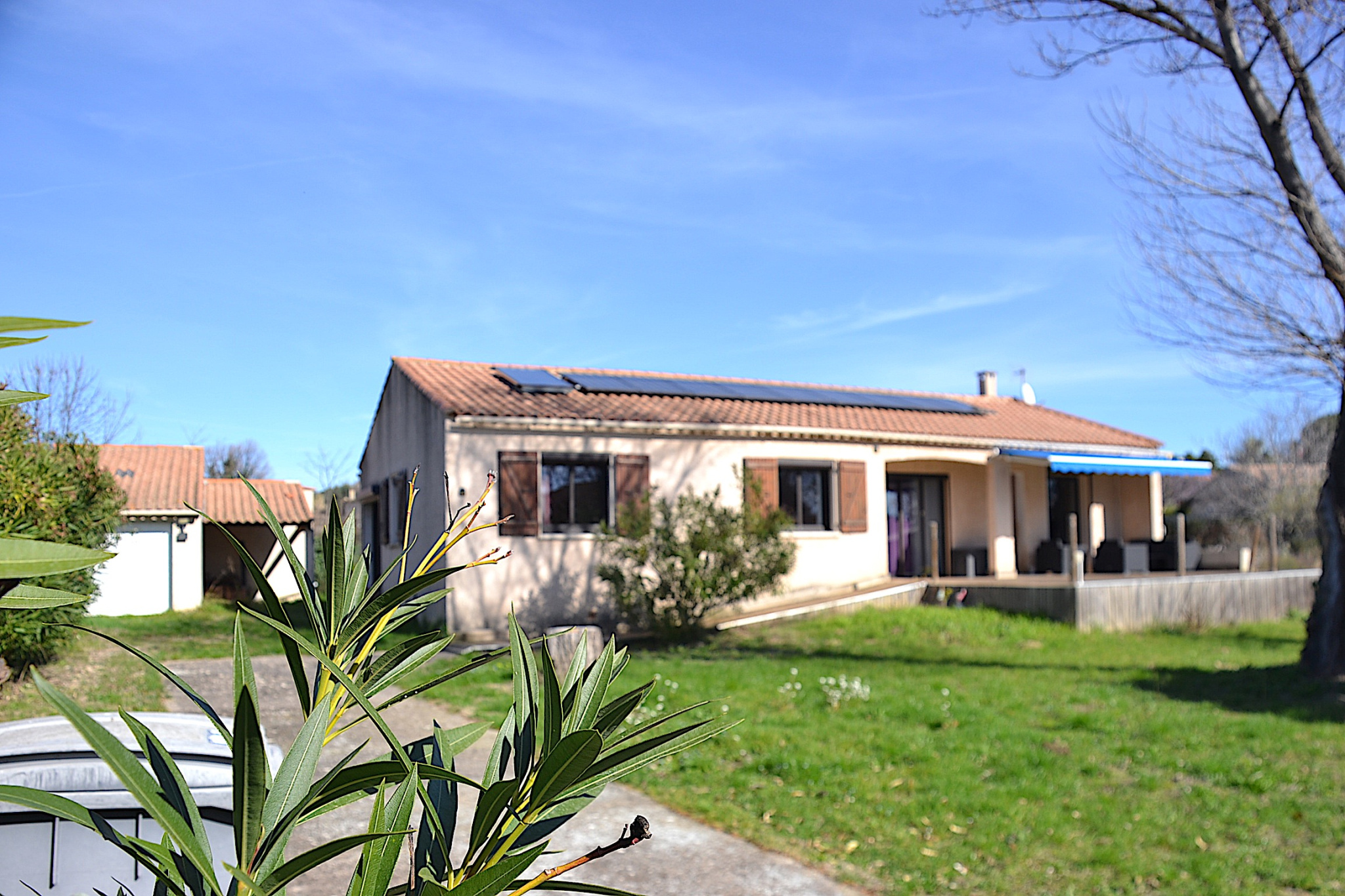 Clermont l'Hérault proche, Villa de plain pied de 120m2 sur 1419 m2 de terrain clos, plat et arboré. Séjour salon 50m2, Cuisine équipé ouverte sur séjour, 4 chambres, sdb et douche, wc, garage, Terrasse. La maison est aux normes handicap et le terrain est Piscinable