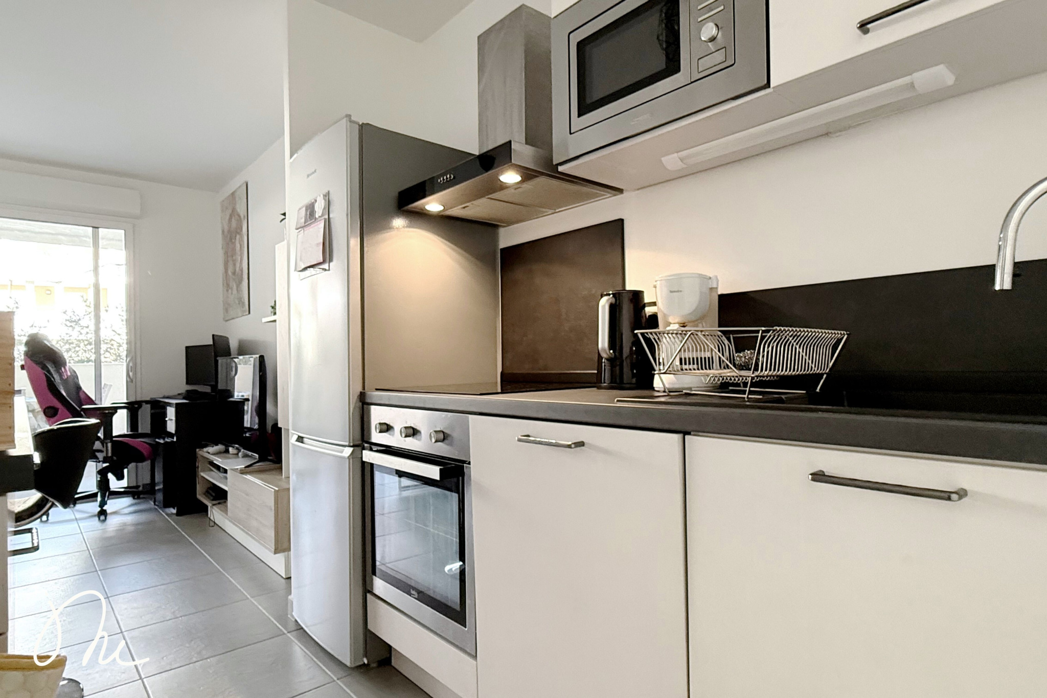 Vous entrez dans une pièce de vie avec cuisine ouverte, aménagée et équipée et un espace buanderie