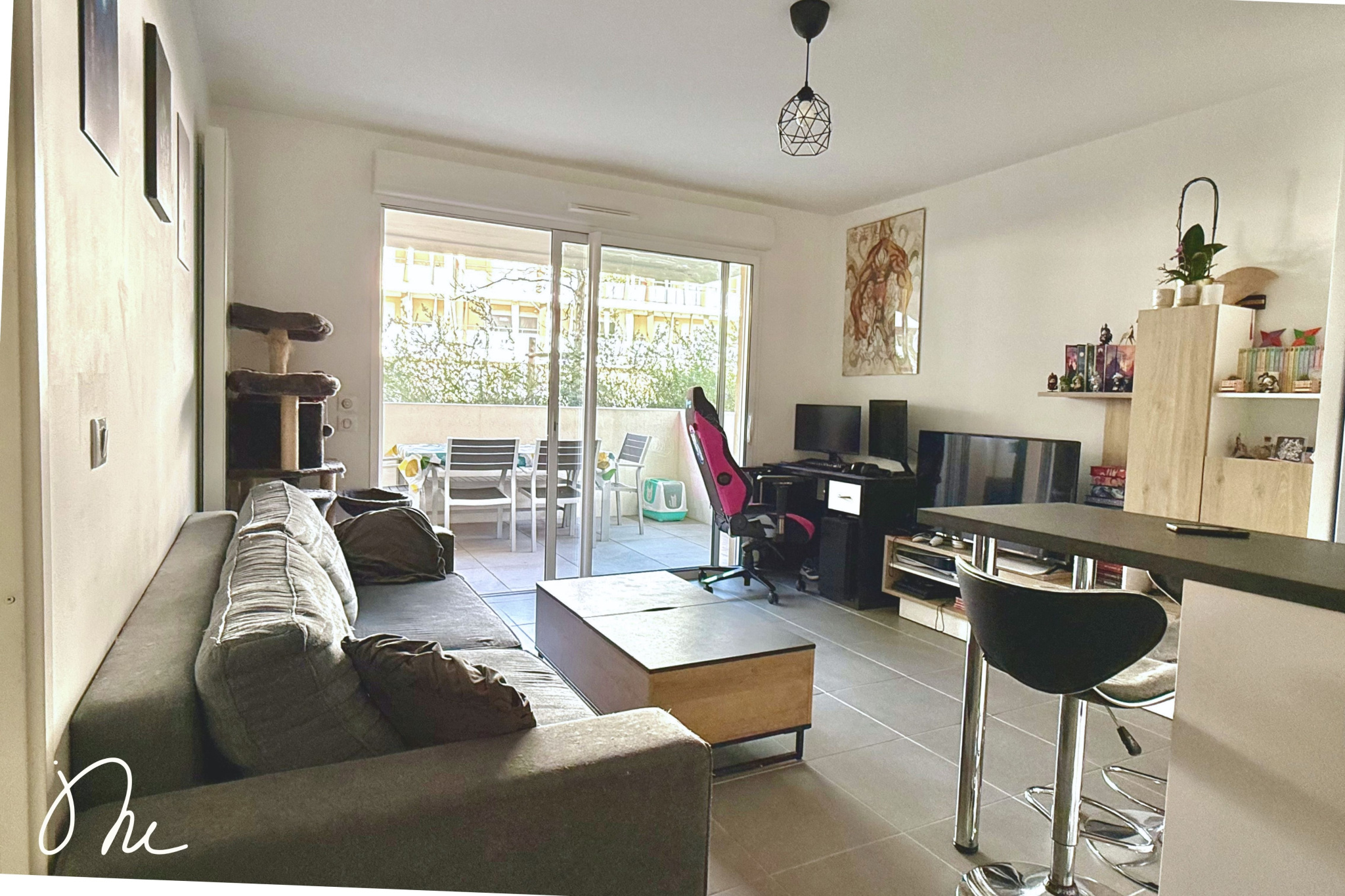 Une baie vitrée vous donne accès à la belle TERRASSE couverte de presque 12 m² : IDÉALE pour profiter de notre climat méditerannéen.
