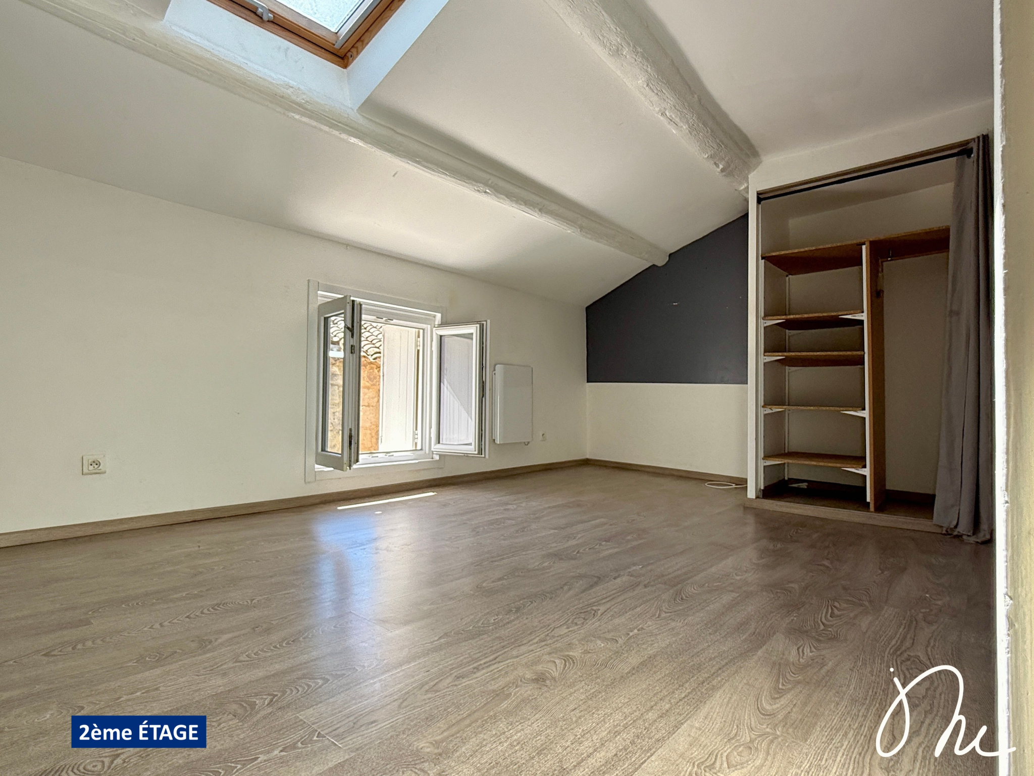 - au 2e étage : une grande pièce baignée de lumière grâce à ses fenêtres et Velux, 2 chambres et une salle de bains avec WC complètent l’ensemble