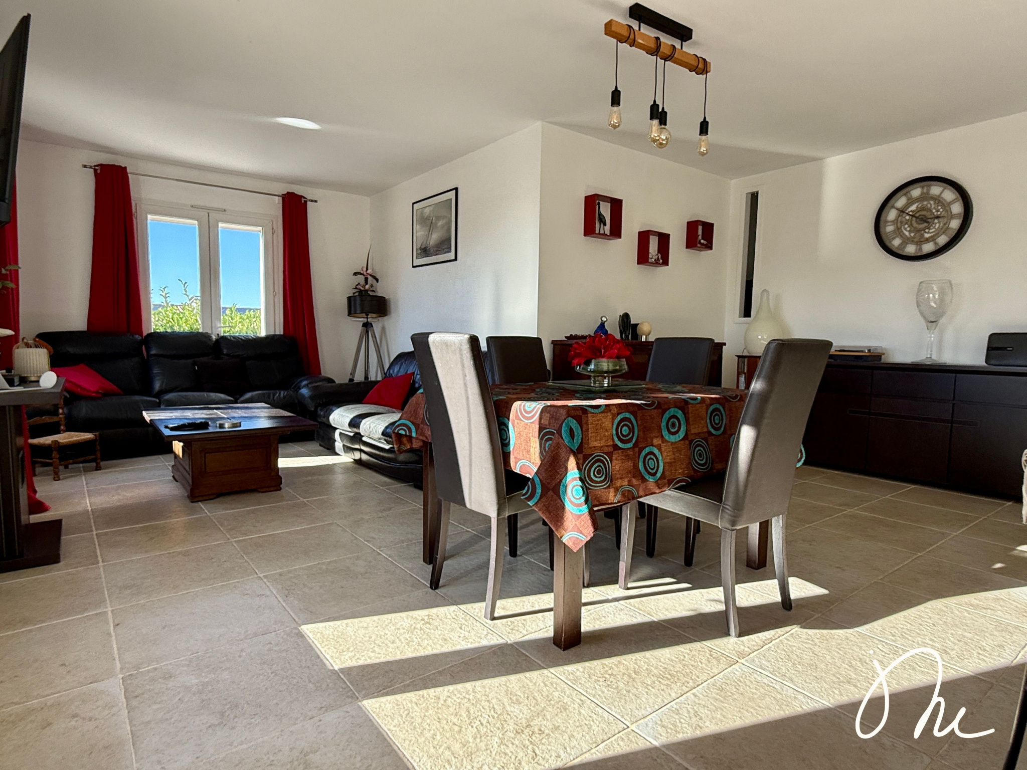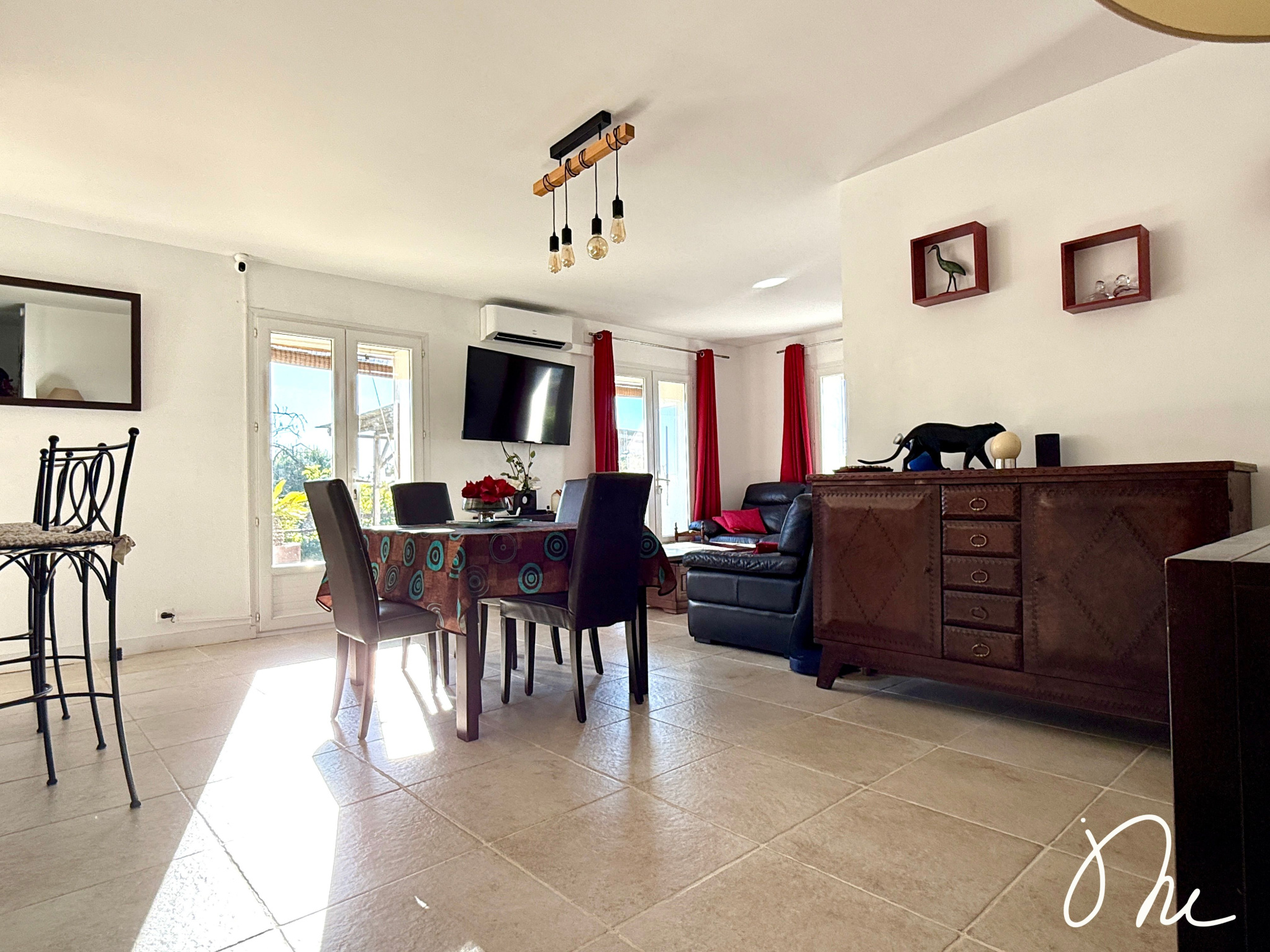 Entièrement de plain-pied, elle est très bien agencée avec son entrée qui dessert le grand séjour lumineux et sa cuisine ouverte, aménagée et équipée. Le tout est baigné de lumière avec une exposition sud et donne accès à une grande terrasse bois et une piscine enterrée au sel.