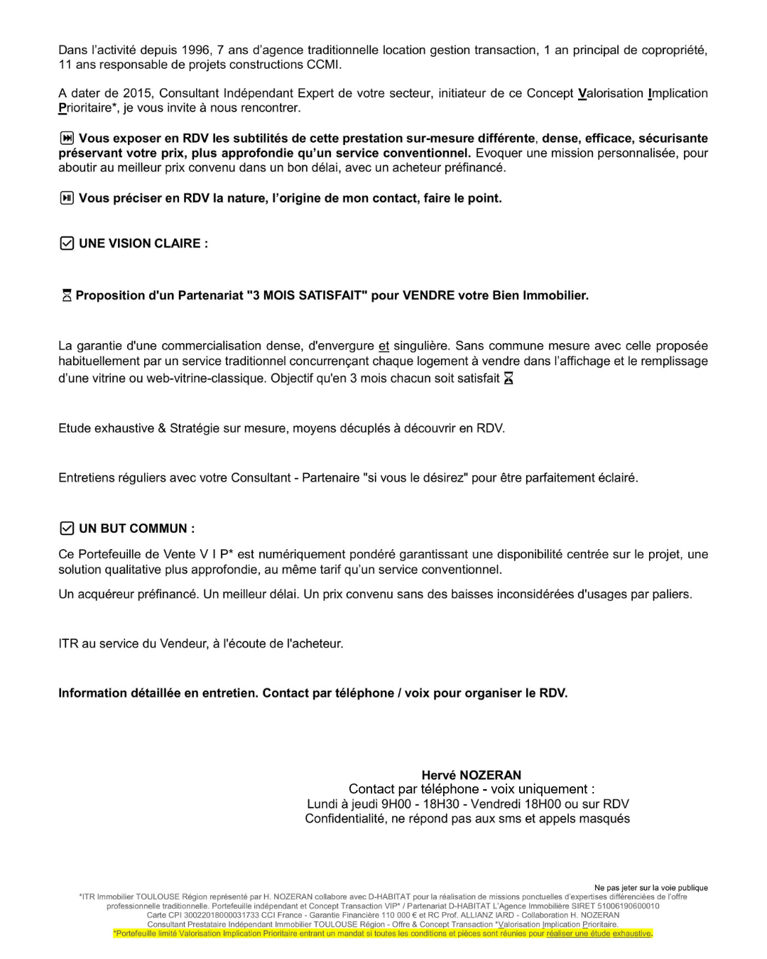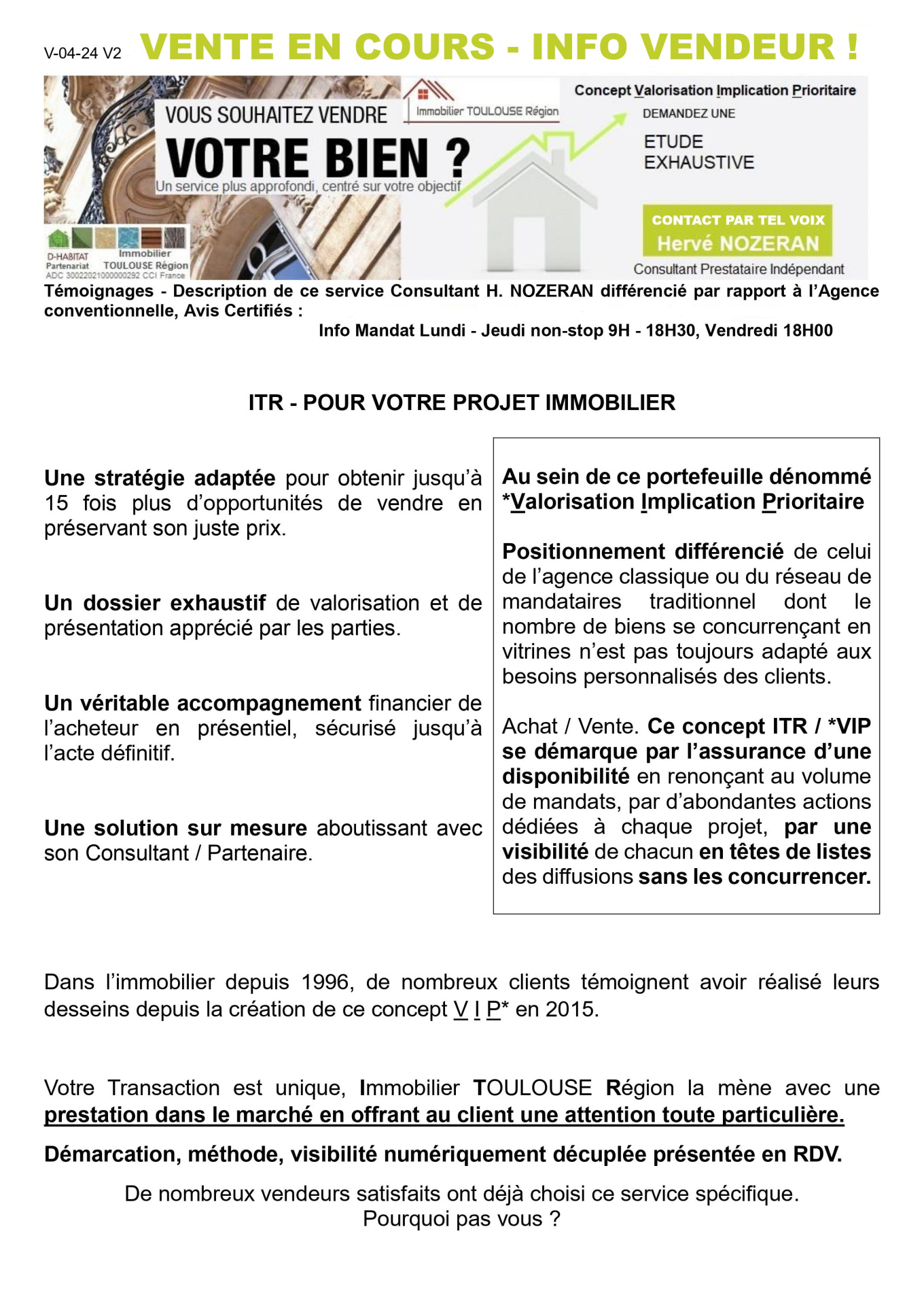 Méthode, rigueur, efficacité, bon tarif, commercialisation plus dense en 3 MOIS grâce à une mission de vente spécialement dédiée sur mesure. Au préalable, étude exhaustive, acheteur préfinancé. Service différent de l’Agence ou du Réseau mandataire conventionnel. Service Immobilier TOULOUSE Région représenté par Hervé NOZERAN proposant de bénéficier d’un concept et d’une mission de vente dénommée *Valorisation Implication Prioritaire. Entre autres atouts du concept VIP* la multidiffusion de l’annonce dans une large zone de chalandise étudiée autant dans l’intérêt de l’acheteur que du vendeur.