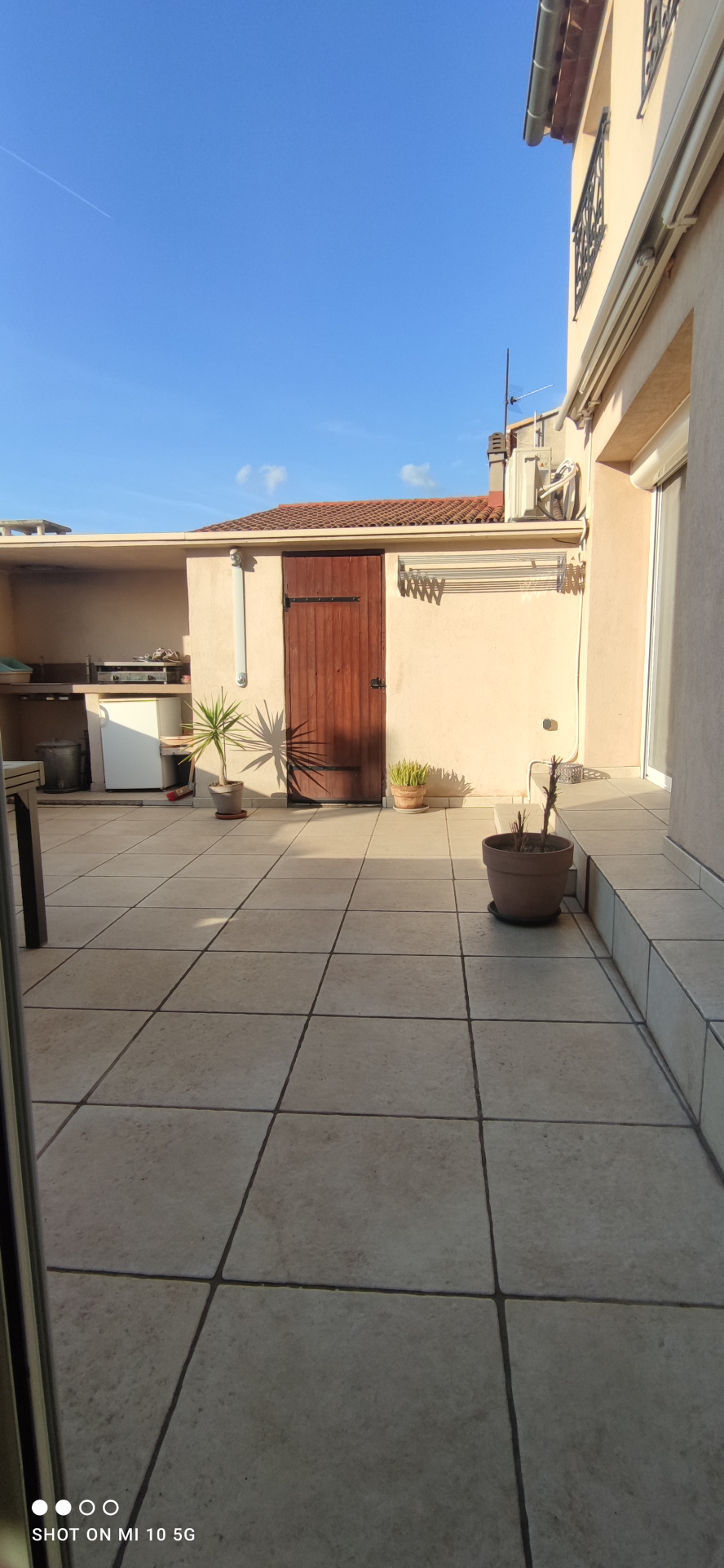 afin de recevoir vos convives, belle terrasse de 25 m² carrelée et aménagée d'un abri de rangement, barbecue couvert, point d'eau, douche et store banne électrique à coffre.