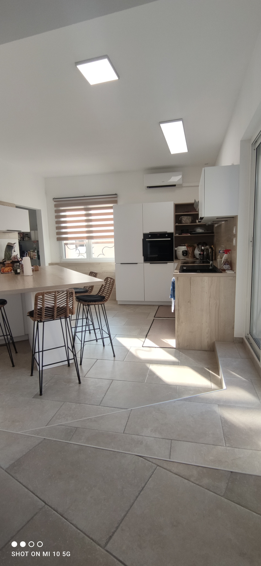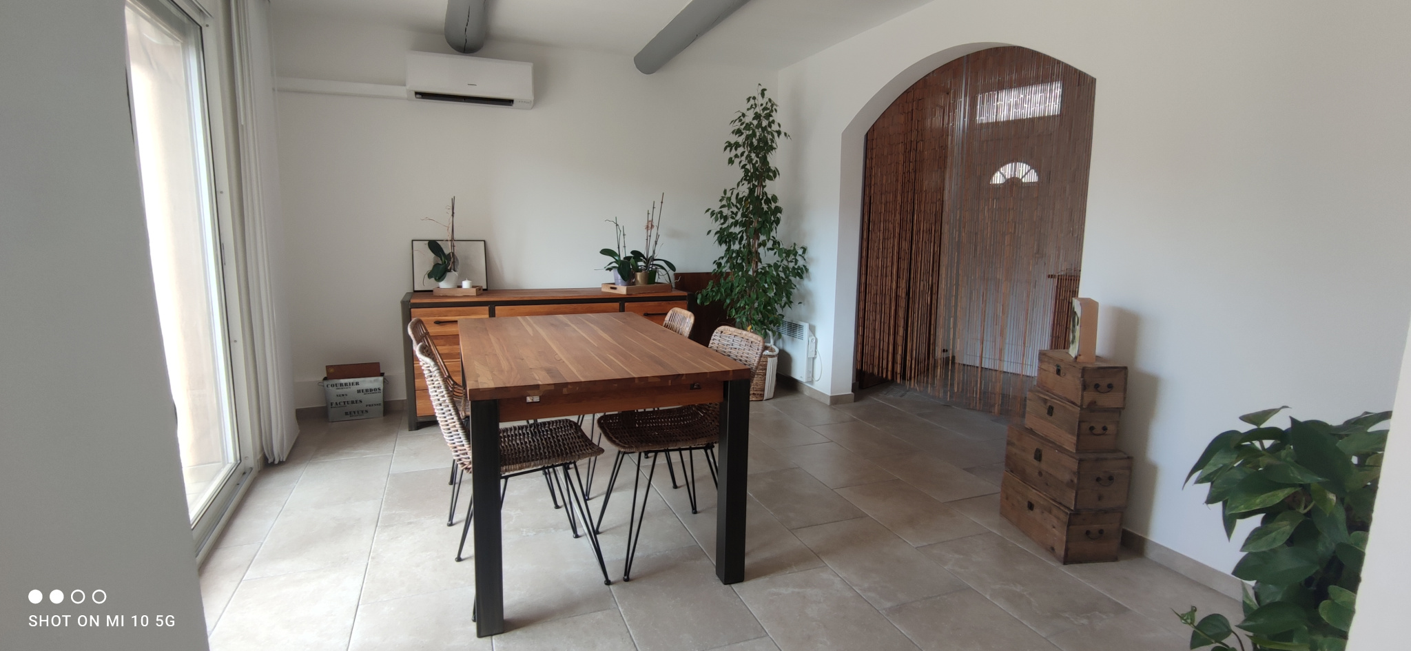 Hall d'entrée spacieux et lumineux offrant un beau placard ainsi qu'un espace buanderie/cellier et toilette (L.mains), un séjour climatisé et lumineux par sa baie vitrée accédant à la terrasse, un salon cosy doté d'un poêle à granulés ouvert sur une cuisine contemporaine climatisée (4 ans) entièrement équipée offrant de nombreux rangement et dotée d'un comptoir repas (petit cellier en sup) fenêtre et baie vitrée d'accès à la terrasse.