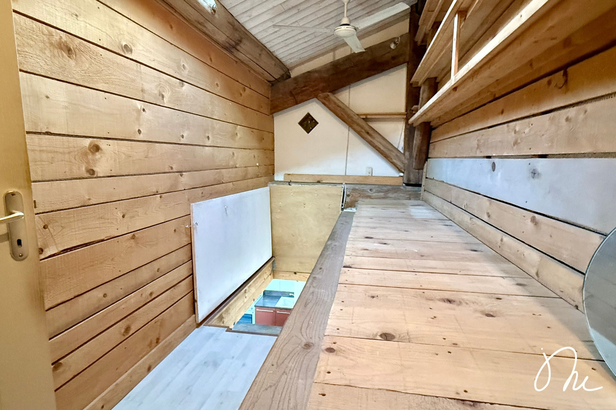 Depuis l'appartement, par un escalier intérieur, vous accédez à un espace mansardé avec nombreux rangements et espace nuit ( 12,60 m² au sol )