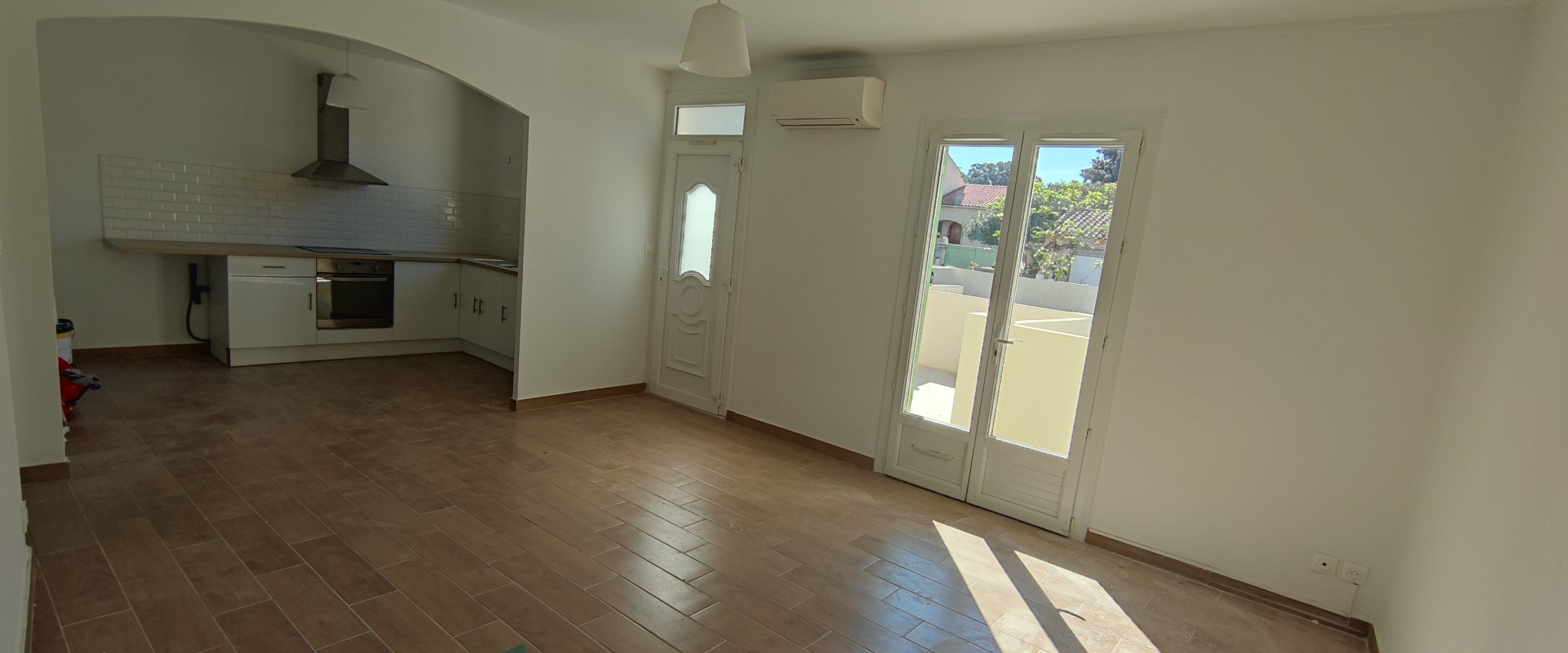 Faisant office d'accueil, une belle terrasse privative carrelée de 13 m², porte d'entrée en PVC offrant 29 m² de pièce de vie avec cuisine ouverte aménagée et équipée agrémentée d'une porte fenêtre donnant sur la belle terrasse orientée Sud.