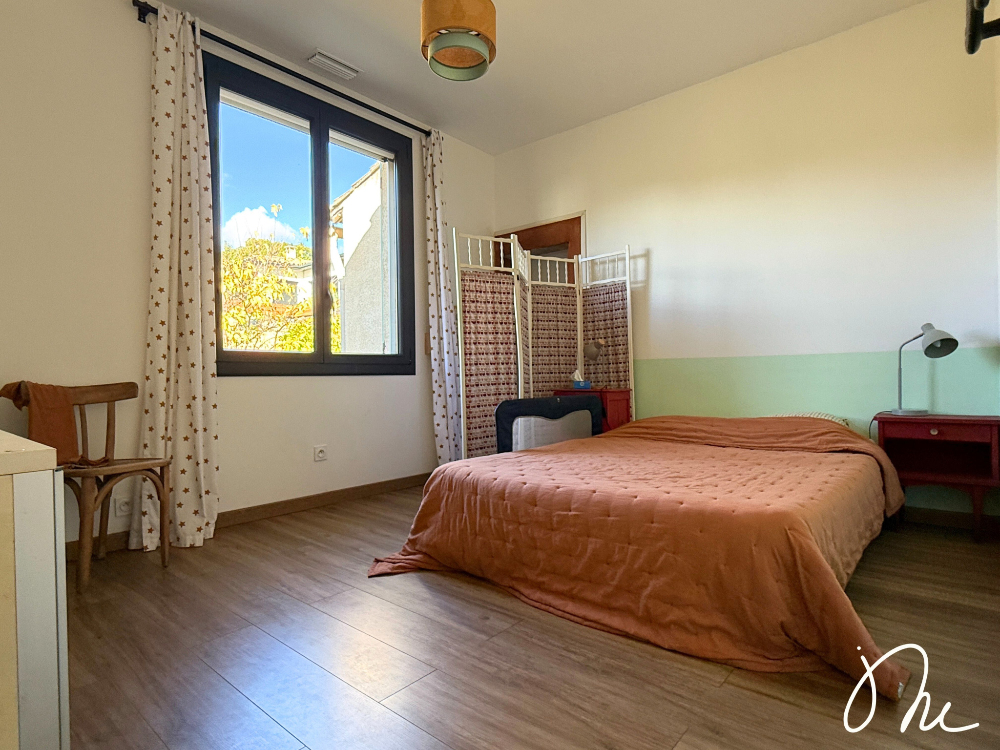 Très lumineuse et bien agencée : tout se vit principalement de plain-pied avec un séjour baigné de lumière avec sa triple exposition, une cuisine indépendante, trois chambres, un dressing, une salle d’eau et un WC séparé. À l’étage, une mezzanine et un bureau offrent un espace supplémentaire pour télétravailler, jouer ou lire.