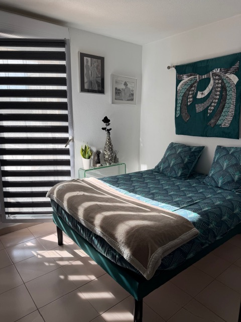 Salon, cuisine aménagée équipée ouverte ,1 chambre avec salle d'eau .